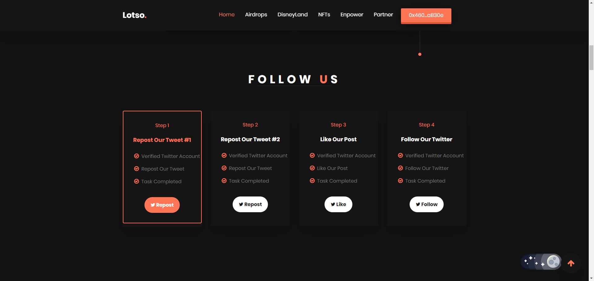 Click our website: Lotso.org, click 'Connect' button and scroll down the webpage to jump to airdrop page.